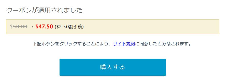 クーポンコードを入力後、「適用」をクリックすると割引きされます。